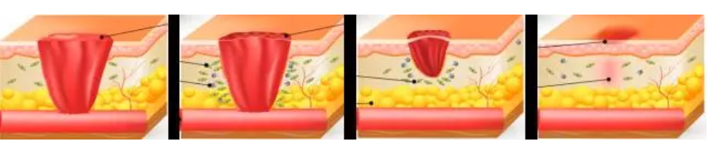 當(dāng)皮膚受傷后,機(jī)體會(huì)有一系列的生化程序試圖進(jìn)行修復(fù)?;具^程包括止血期,炎癥期,細(xì)胞增生期以及成熟及重塑期。